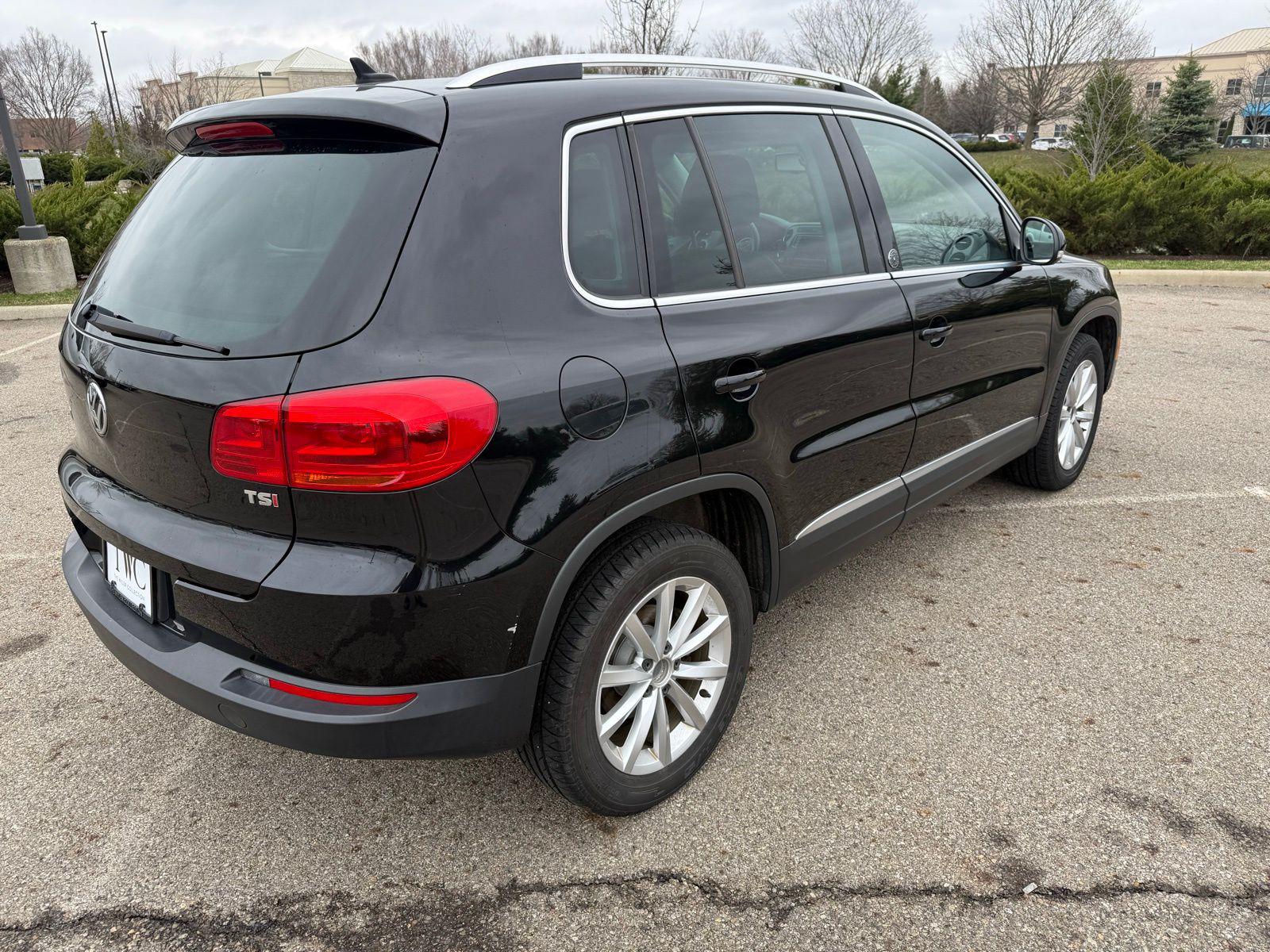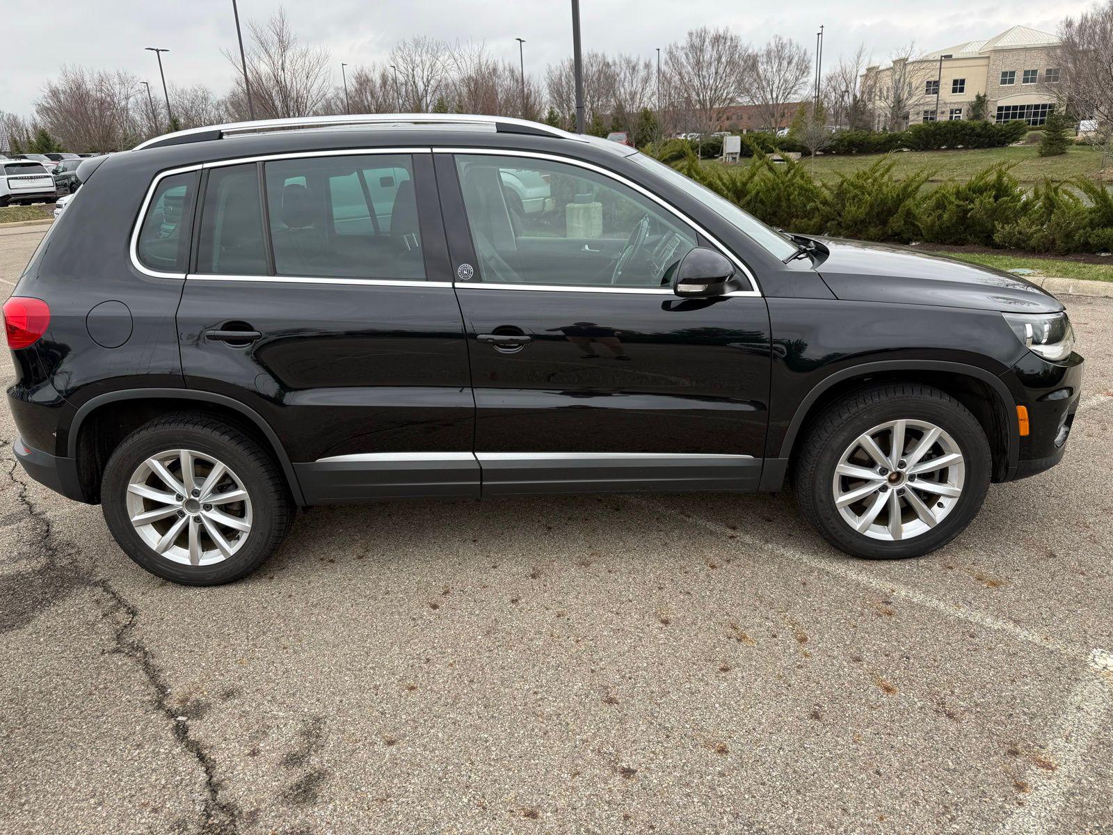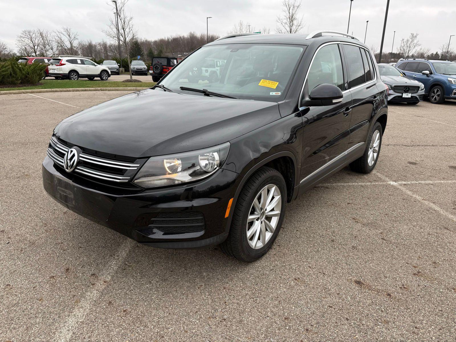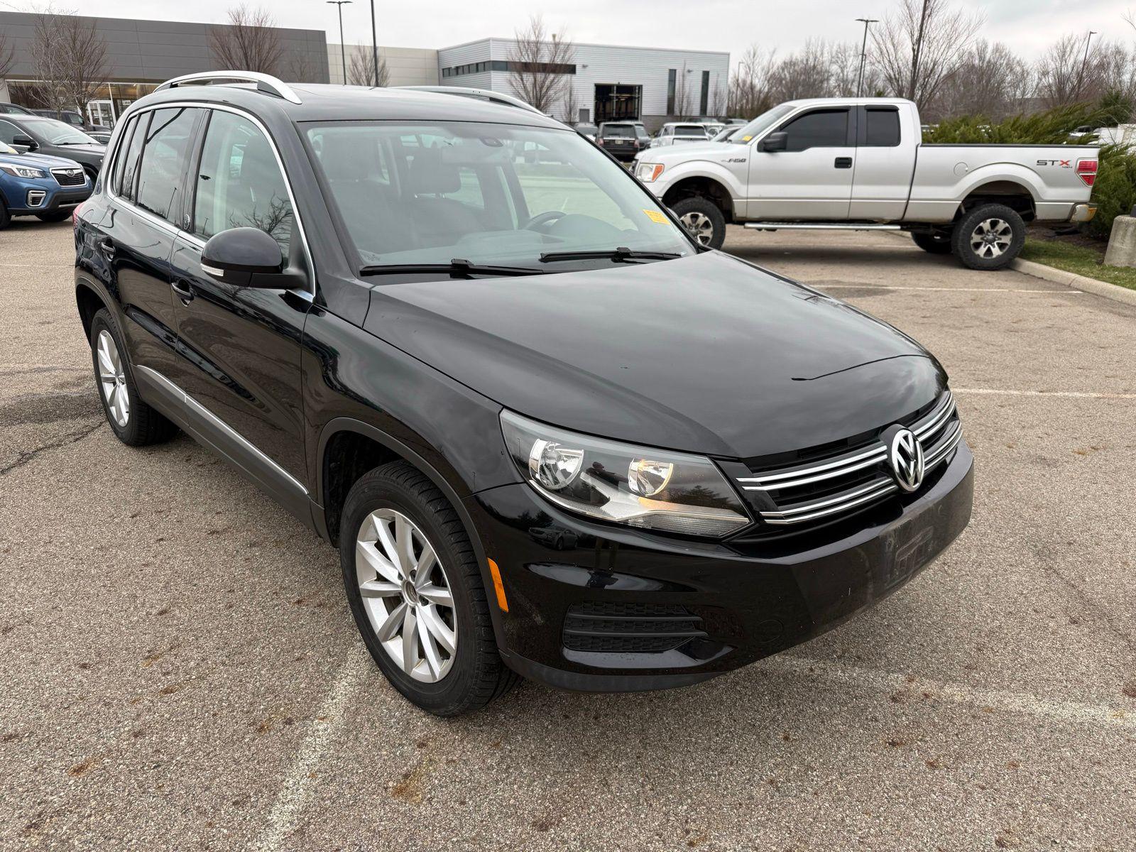 Deep Black Pearl 2017 Volkswagen Tiguan 2.0T Wolfsburg Edition FWD 6-Speed Automatic with Tiptronic 2.0L TSI DOHC3.45 Axle Ratio, 4-Wheel Disc Brakes, 8 Speakers, ABS brakes, Air Conditioning, Alloy wheels, AM/FM radio: SiriusXM, Auto-dimming Rear-View mirror, Brake assist, Bumpers: body-color, CD player, Compass, Driver door bin, Driver vanity mirror, Dual front impact airbags, Dual front side impact airbags, Electronic Stability Control, Emergency communication system: VW Car-Net, Exterior Parking Camera Rear, Four wheel independent suspension, Front anti-roll bar, Front Bucket Seats, Front Center Armrest w/Storage, Front reading lights, Fully automatic headlights, Heated door mirrors, Heated Front Bucket Seats, Heated front seats, Illuminated entry, Leather Shift Knob, Leather steering wheel, Low tire pressure warning, Occupant sensing airbag, Outside temperature display, Overhead airbag, Overhead console, Panic alarm, Passenger door bin, Passenger vanity mirror, Power door mirrors, Power driver seat, Power moonroof, Power passenger seat, Power steering, Power windows, Radio data system, Radio: AM/FM/HD/CD w/USB & Aux-In, Rain sensing wipers, Rear anti-roll bar, Rear reading lights, Rear seat center armrest, Rear window defroster, Rear window wiper, Remote keyless entry, Roof rack: rails only, Security system, Speed control, Speed-sensing steering, Split folding rear seat, Spoiler, Steering wheel mounted audio controls, Tachometer, Telescoping steering wheel, Tilt steering wheel, Traction control, Trip computer, Turn signal indicator mirrors, V-Tex Leatherette Seating Surfaces, Variably intermittent wipers, and Wheels: 17"" Novara Alloy. Recent Arrival! Odometer is 27409 miles below market average!Reviews: * Sporty handling doesn't come at the expense of a comfortable ride quality (except Sport trim); engine offers punchy turbocharged performance; interior materials feel premium; cabin is quiet at highway speeds. Source: Edmunds
