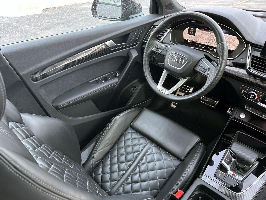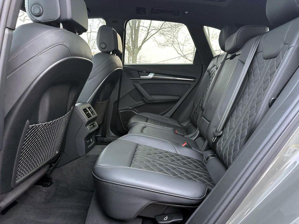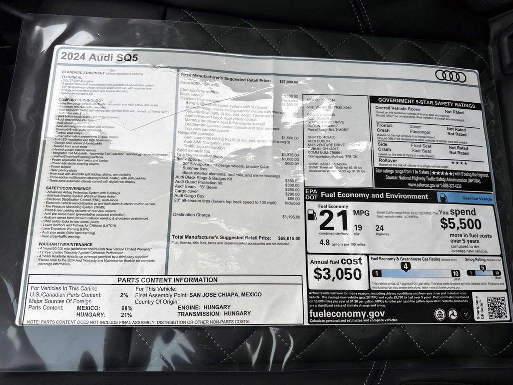 Chronos Gray Metallic 2024 Audi SQ5 Premium Plus quattro quattro 8-Speed Automatic with Tiptronic 3.0L TFSI Audi Virtual Cockpit Plus, Bang & Olufsen 3D Sound System, Black Exterior Mirror Housings, Black Exterior Trim, Black Optic Package, Convenience Package, Leatherette Covered Center Console & Door Armrests, Navigation Package, Panoramic Sunroof, Premium Plus Package, Radio: MMI Navigation Plus, Top View Camera System, Traffic Sign Recognition, Wheels: 20"" 5-V Spoke-Star Design.Black Optic Package (Black Exterior Mirror Housings, Black Exterior Trim, and Wheels: 20"" 5-V Spoke-Star Design), Convenience Package, Navigation Package (Radio: MMI Navigation Plus and Traffic Sign Recognition), Premium Plus Package (Audi Virtual Cockpit Plus, Bang & Olufsen 3D Sound System, Leatherette Covered Center Console & Door Armrests, Panoramic Sunroof, and Top View Camera System), 10 Speakers, 4-Wheel Disc Brakes, ABS brakes, Adaptive suspension, Air Conditioning, Alloy wheels, AM/FM radio, AM/FM Stereo, Auto High-beam Headlights, Auto-dimming Rear-View mirror, Automatic temperature control, Brake assist, Bumpers: body-color, Compass, Delay-off headlights, Driver door bin, Driver vanity mirror, Dual front impact airbags, Dual front side impact airbags, Electronic Stability Control, Emergency communication system: Audi connect CARE, Exterior Parking Camera Rear, Four wheel independent suspension, Front anti-roll bar, Front Bucket Seats, Front Center Armrest, Front dual zone A/C, Front fog lights, Front reading lights, Garage door transmitter: HomeLink, Heated door mirrors, Heated front seats, Heated Front Sport Seats, Heated steering wheel, Illuminated entry, Leather Shift Knob, Leather/Dinamica Seating Surfaces, Low tire pressure warning, Occupant sensing airbag, Outside temperature display, Overhead airbag, Overhead console, Panic alarm, Passenger door bin, Passenger vanity mirror, Power door mirrors, Power driver seat, Power Liftgate, Power passenger seat, Power steering, Power windows, Radio data system, Rain sensing wipers, Rear air conditioning, Rear anti-roll bar, Rear fog lights, Rear reading lights, Rear seat center armrest, Rear window defroster, Rear window wiper, Remote keyless entry, Roof rack, Security system, Speed control, Speed-sensing steering, Speed-Sensitive Wipers, Split folding rear seat, Spoiler, Sport steering wheel, Steering wheel mounted audio controls, Tachometer, Telescoping steering wheel, Tilt steering wheel, Traction control, Trip computer, Turn signal indicator mirrors, Variably intermittent wipers, and Wheels: 20"" 10-Spoke-Star Design. Recent Arrival!