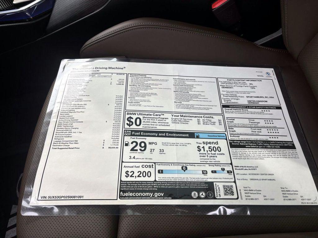 New Price! Certified. Dark Graphite Metallic 2025 BMW X3 30 xDrive AWD 8-Speed Automatic I4 5UX53GP02S9081091, 2,440 mi., CPO warranty expires 06/30/2030 or unlimitedmiles, 8-Speed Automatic, ACC Stop and Go + Active Driving Assistant, BMW Curved Display with HUD, Heated Steering Wheel, Interior Camera, Navigation, Navigation system: BMW Maps Navigation, Parking Assistance Package, Parking Assistant Plus, Parking Assistant Professional, Premium Content 1, Premium Package, Remote Engine Start, Sky Lounge Panoramic Roof, Travel and Comfort System.Parking Assistance Package (Parking Assistant Professional), Premium Package (ACC Stop and Go + Active Driving Assistant, BMW Curved Display with HUD, Heated Steering Wheel, Interior Camera, Parking Assistant Plus, Premium Content 1, Remote Engine Start, Sky Lounge Panoramic Roof, and Travel and Comfort System), BMW Certified Pre-Owned Certified, 8-Speed Automatic, Navigation, Navigation system: BMW Maps Navigation, 12 Speakers, 4-Wheel Disc Brakes, ABS brakes, Air Conditioning, Alloy wheels, AM/FM Radio, AM/FM radio: SiriusXM, Apple CarPlay and Android Auto Compatibility, Auto High-beam Headlights, Auto-dimming door mirrors, Auto-dimming Rear-View mirror, Automatic temperature control, BMW Assist ECall, BMW TeleServices, Brake assist, Bumpers: body-color, Delay-off headlights, Driver door bin, Driver vanity mirror, Dual front impact airbags, Dual front side impact airbags, Electronic Stability Control, Emergency communication system: BMW Assist eCall, Exterior Parking Camera Rear, Four wheel independent suspension, Front anti-roll bar, Front Bucket Seats, Front Center Armrest, Front dual zone A/C, Front reading lights, Fully automatic headlights, Garage door transmitter, Heated door mirrors, Heated Front Seats, Heated front seats, Hi-Fi Sound System, Illuminated entry, Knee airbag, Low tire pressure warning, Lumbar Support, Memory seat, Occupant sensing airbag, Outside temperature display, Overhead airbag, Overhead console, Panic alarm, Passenger door bin, Passenger vanity mirror, Personal ESIM 5G, Power door mirrors, Power driver seat, Power Front Seats, Power Liftgate, Power passenger seat, Power steering, Power windows, Radio data system, Rain sensing wipers, Rear anti-roll bar, Rear Climate Control Console, Rear reading lights, Rear seat center armrest, Rear window defroster, Rear window wiper, Remote keyless entry, Security system, SiriusXM Satellite Radio with 1 Year Subscription, Speed control, Speed-Sensitive Wipers, Split folding rear seat, Spoiler, Sport Seats, Sport steering wheel, Steering wheel mounted audio controls, Tachometer, Telescoping steering wheel, Tilt steering wheel, Traction control, Trip computer, Turn signal indicator mirrors, Variably intermittent wipers, Veganza Perforated and Quilted Upholstery, Wheels: 19"" x 8.5"" Aero Midnight Grey Bicolor, Wheels: 20"" x 9.0"" Front and 20"" x 10.5"" Rear Bicolor, and Wireless Device Charging. 27/33 City/Highway MPGBMW Certified Pre-Owned Details: * Limited Warranty: 12 Month/Unlimited Mile * Multipoint Point Inspection * Vehicle History * Warranty Deductible: $0 * Roadside Assistance * Transferable Warranty * 1 year/Unlimited miles beginning after new car warranty expires. 6-yrs Roadside Assistance. SiriusXM Satellite Radio 3-mos free. Every BMW Certified Plug-in Hybrid comes with an 8-Year/100,000-Mile Battery Guarantee. The Initial Battery Transfers to the New Owner.